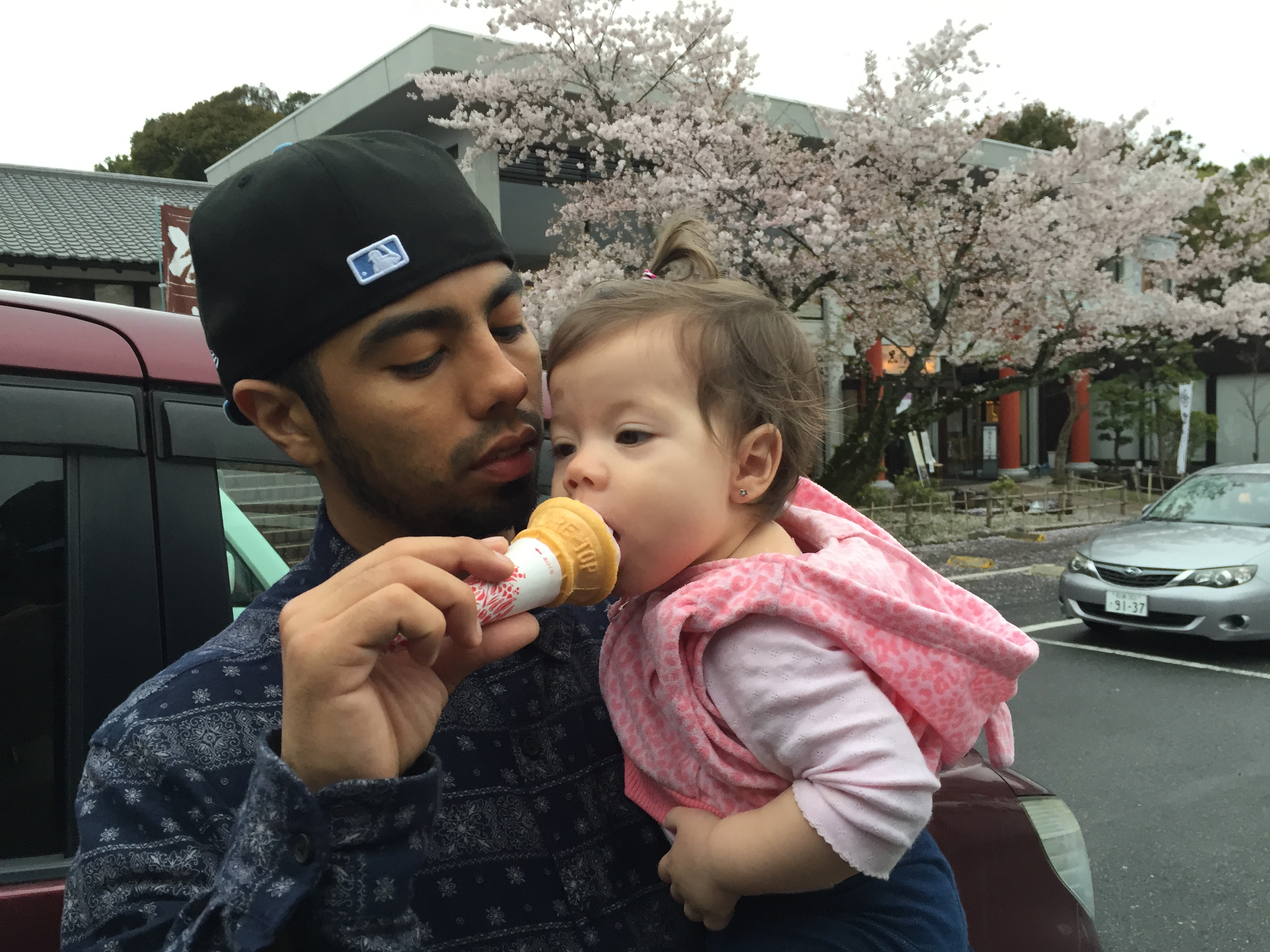 The wonderful couple we stayed with (our airplane friend’s parents). Here we are at Daigoji, a place they’d never been either, in front of a gate where you “docked your horse”.Rosalyn’s first ice cream, “sakura flavored”. I’m not sure how accurate the flavor is, but Rosalyn loved it and seemed to think it was hers instead of us sharing with her.Our hosts made okonomiyaki for us, which had some bacon, lots of cabbage and batter. Think of it as a savory (as compared to sweet) dinner pancake.We even had dinner with their friends! They’re amazing cooks as well and we had a great time using Japanese all night and being in a total Japanese setting. So much of what we do is bilingual, so this was a really great opportunity for us.We went to a stunning location called Kiyomizudera, along with everyone else in Japan, it seems. They do a special light up of the spot at night. We climbed a mountain to get here (literally), and with a 20 pound baby sack hanging off you, I was a bit out of breath by the end of it. But the view was worth it! I would love to see it some day converted into a place to offer worship to the true God Jesus!Sometimes, I do feel like we’re standing on opposite sides of an issue, haha! No, we actually were in a shopping mall and there marked the border between the two prefectures.